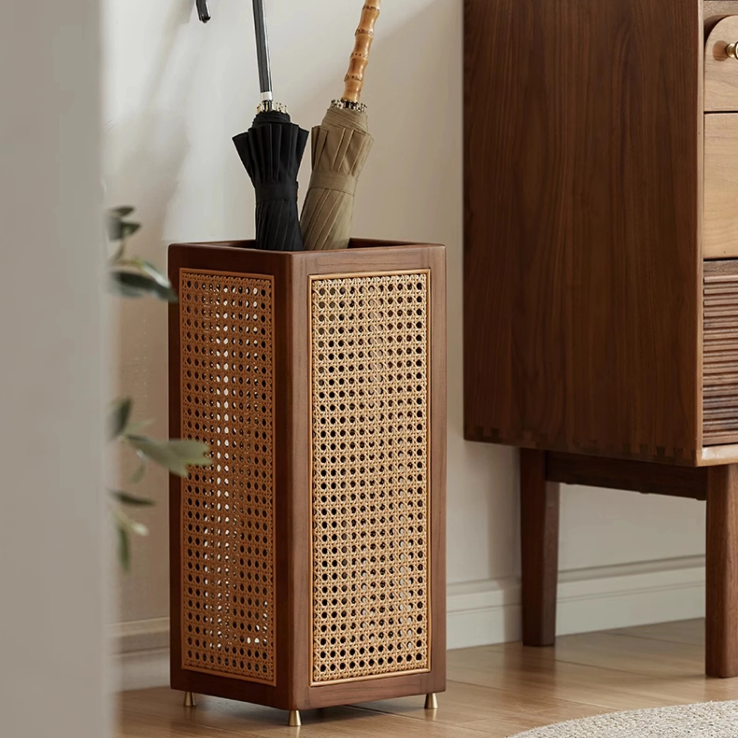 天然木材使用!おしゃれなラタン編みの傘立て - 商業用・家庭用に最適な水切り機能付きの傘収納ラック。玄関や入口にぴったり!インテリアにも馴染むデザインで、スタイリッシュに収納!