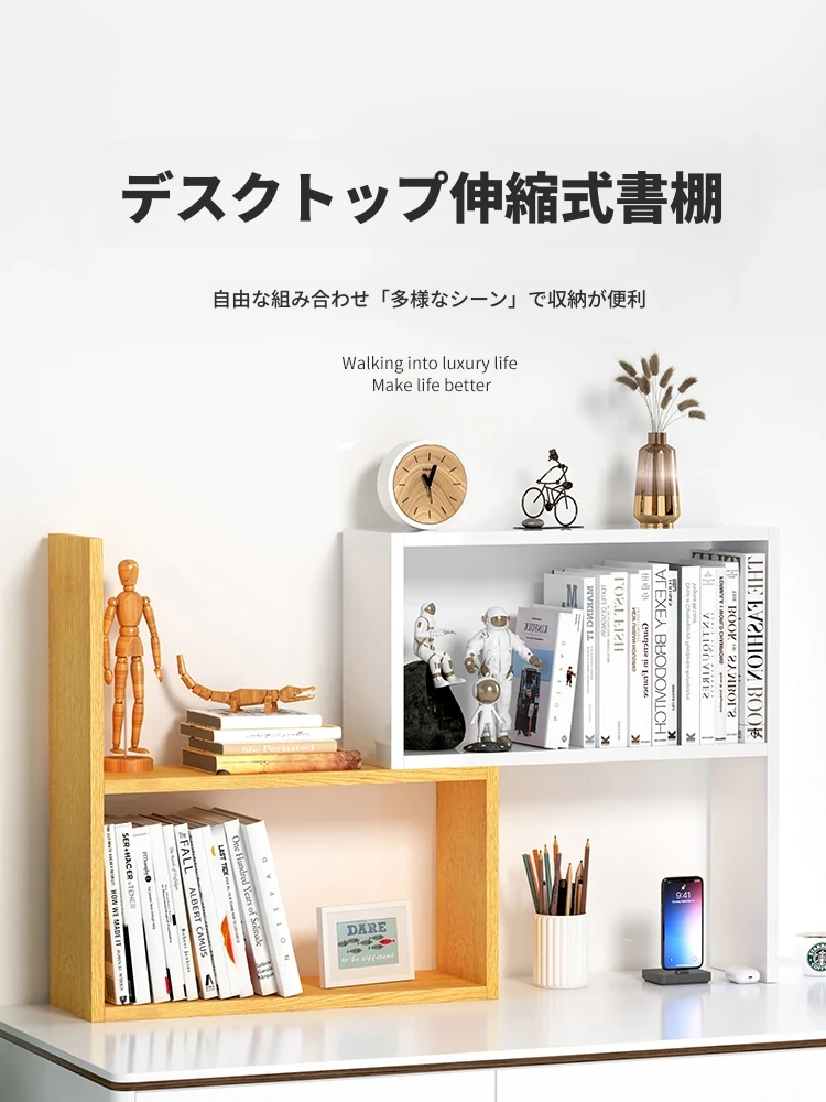 伸縮可能なデスク用コーナー本棚 - デスク上の二段収納スペースで、オフィスをスッキリ整理!多層の収納棚で、書類や文具をすっきり収納。コンパクトサイズで、限られたスペースにも最適です!
