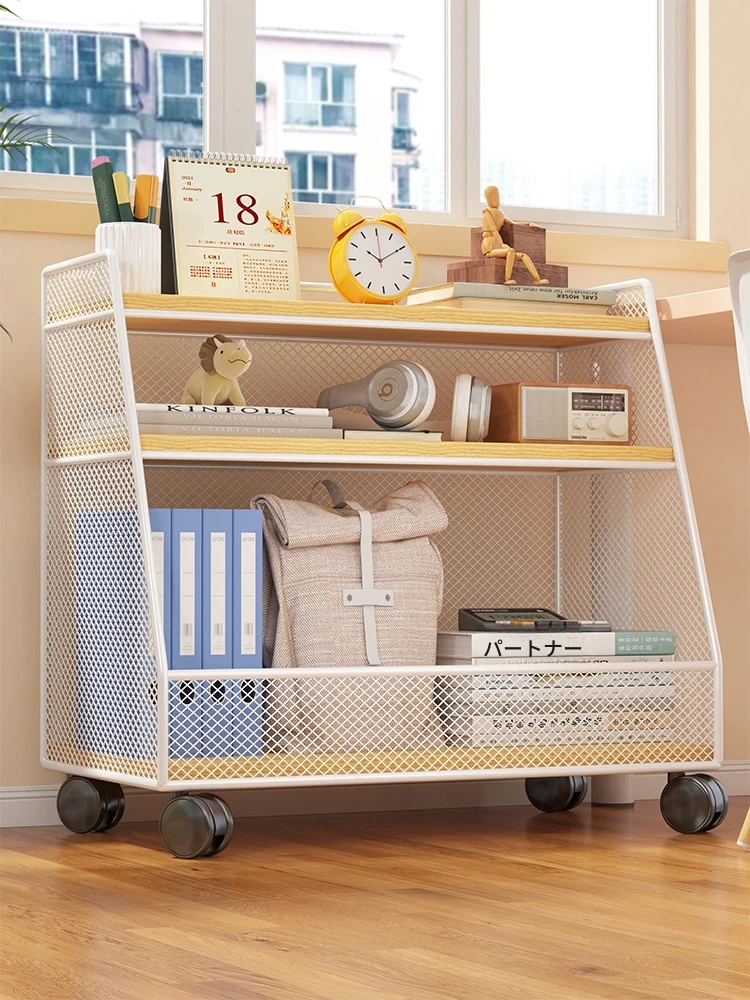 子供用フロア書棚 移動式収納キャスター付 多段書バスケット 学生向けテーブルサイド収納ラック 簡単組立!お部屋をスッキリ整理整頓!